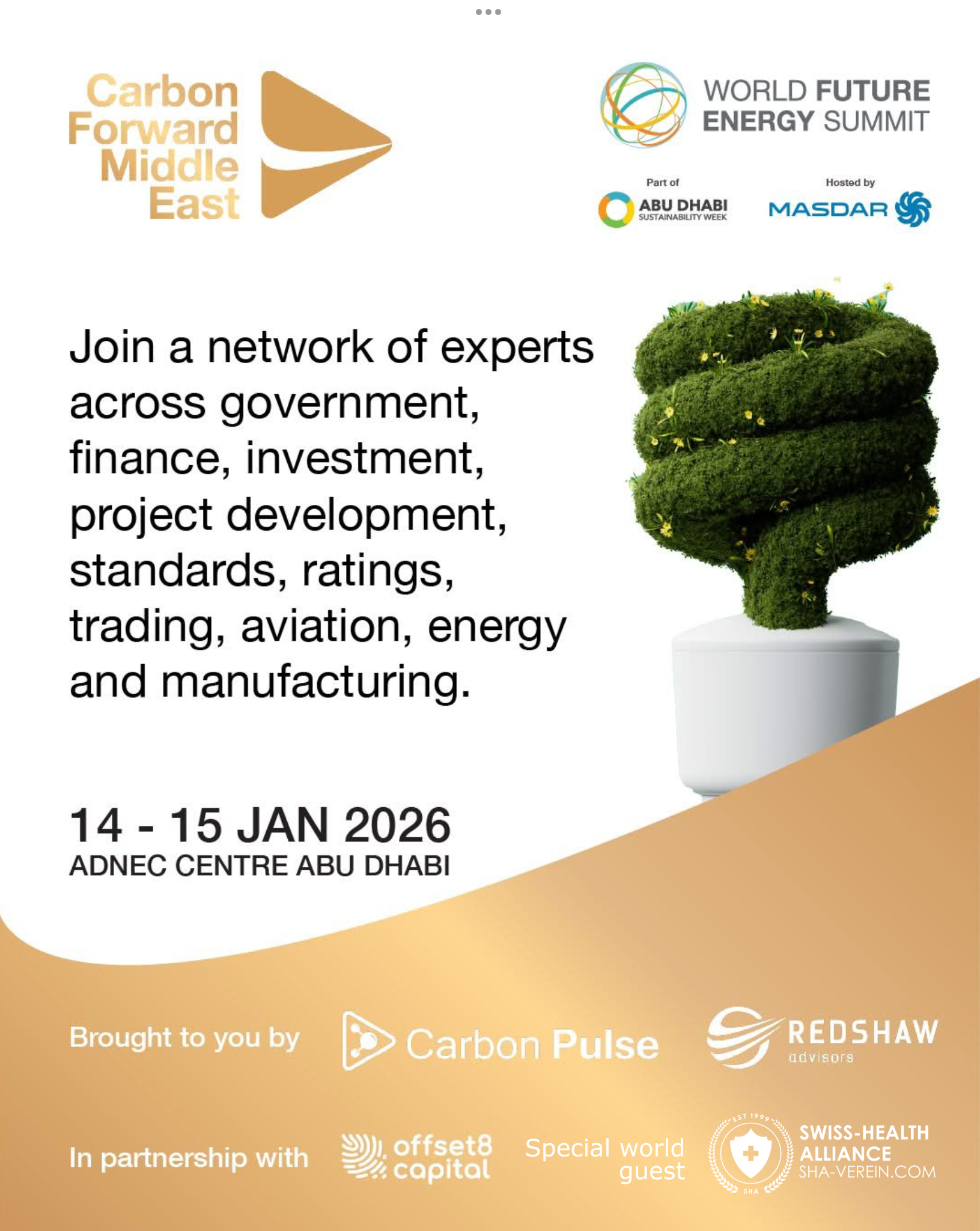The Swiss-Health Alliance (SHA) is taking part in the World Future Energy Summit because health and sustainability are inextricably linked. A clean, intact environment is the basis for people's well-being - without a healthy planet, there can be no long-term health.